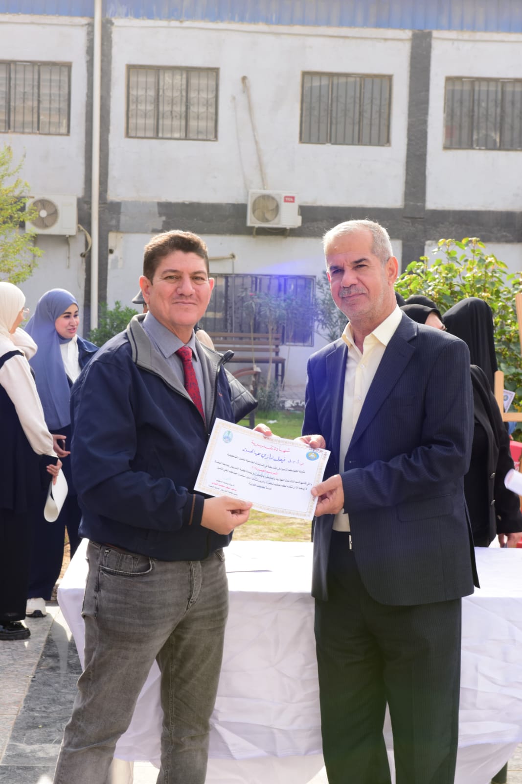 حيث كرم السيد العميد الطلبة الفائزين وفي المراكز الاولى لحصولها عل مركز متقدم في المسابقة التنافسية التي جرت بين الطلبة للرسم الحر في المعرض وفي ختام المعرض قدم عميد الكلية شكره وتقديره للطلبة المشاركين والقائمين على النشاط .